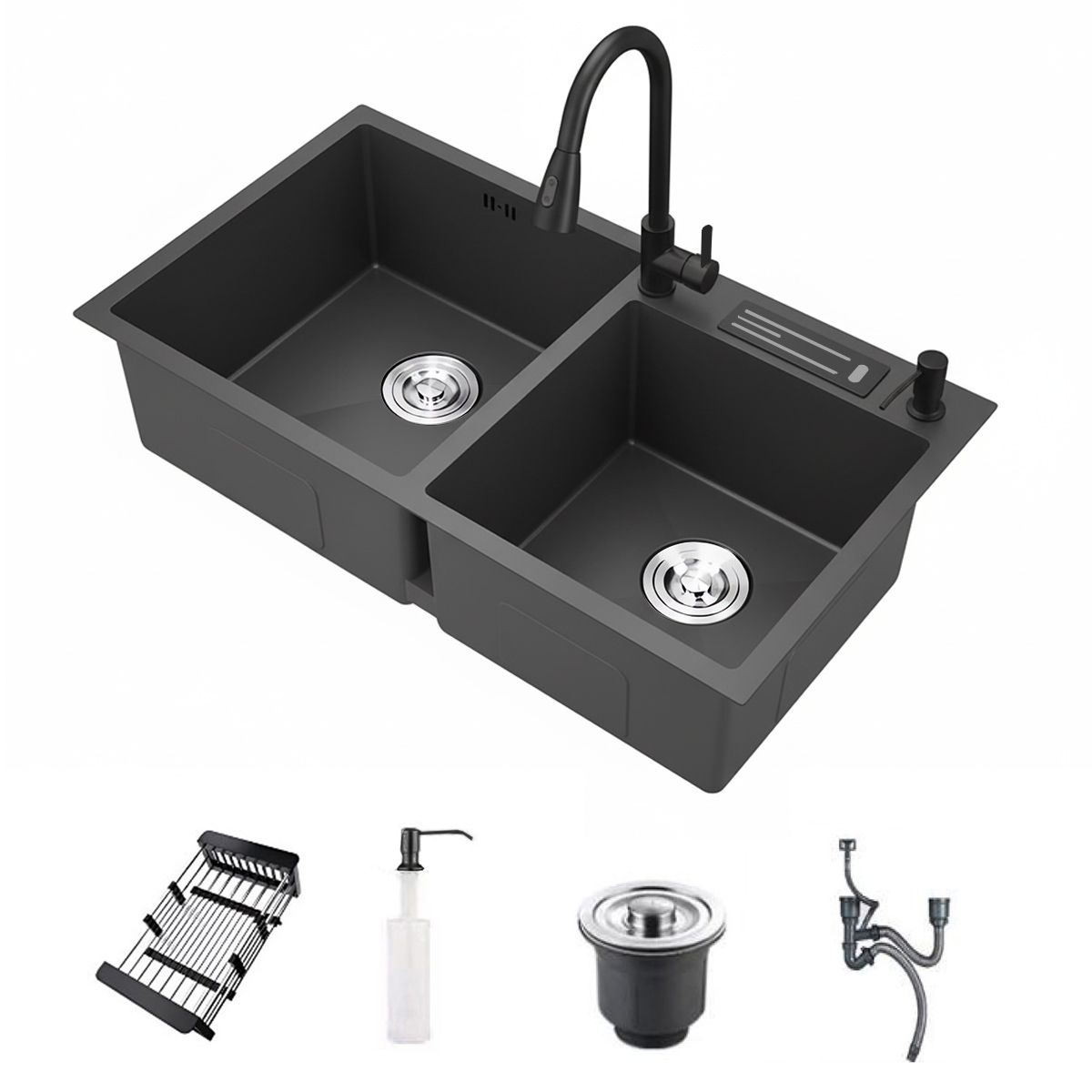Combo Pileta de cocina doble 78 x 45 cm + Grifo extensible (ambas acero inoxidable 304) + Accesorios – color gris grafito en pileta y negro mate en grifería