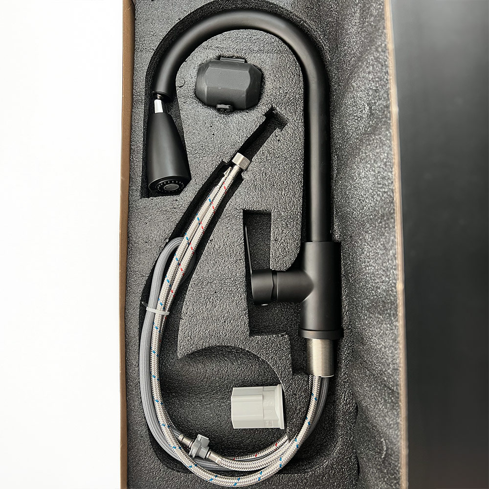 - Grifería monocomando de acero inoxidable SUS 304 color negro mate con pico extraíble.