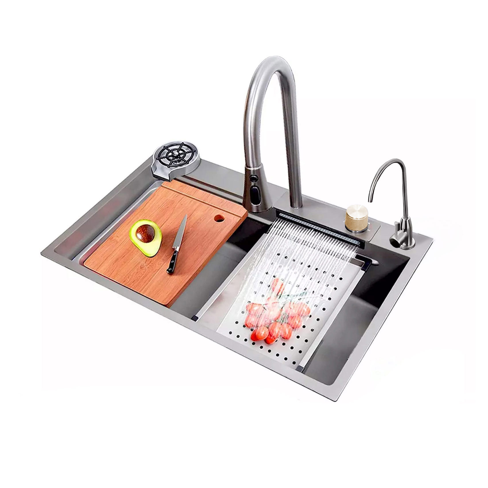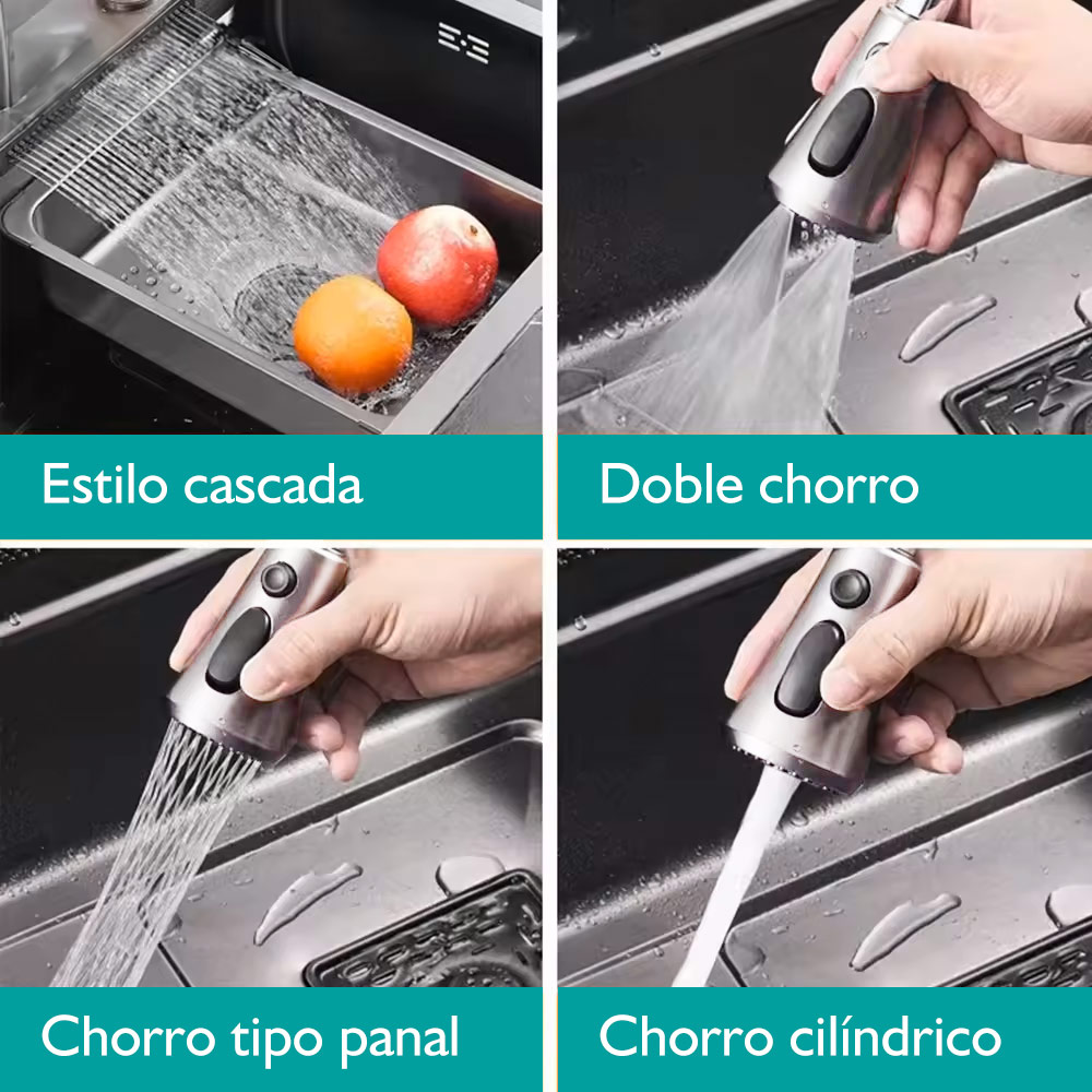 • Múltiples salidas de agua: Este modelo ofrece cuatro tipos de chorro: estilo cascada, doble chorro, tipo panal y cilíndrico. Ideal para distintas tareas, desde un flujo suave hasta uno más potente, adaptándose a todas las necesidades de tu cocina.