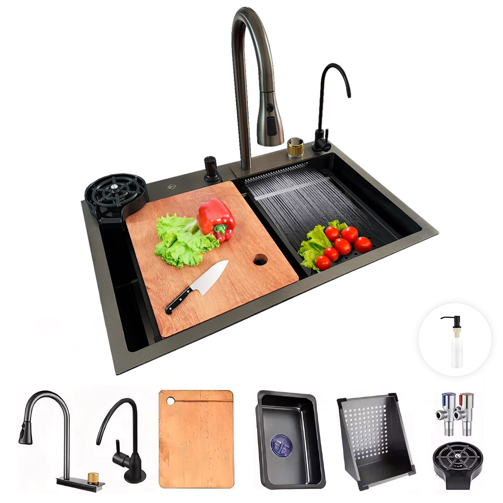 Esta pileta viene equipada con un elegante grifo tipo extraíble, y uno tipo cascada también hecho de acero inoxidable SUS 304, que añade un toque de estilo a tu cocina. Además, incluye un práctico escurridor y una cesta de drenaje para facilitar el lavado y secado de los platos.