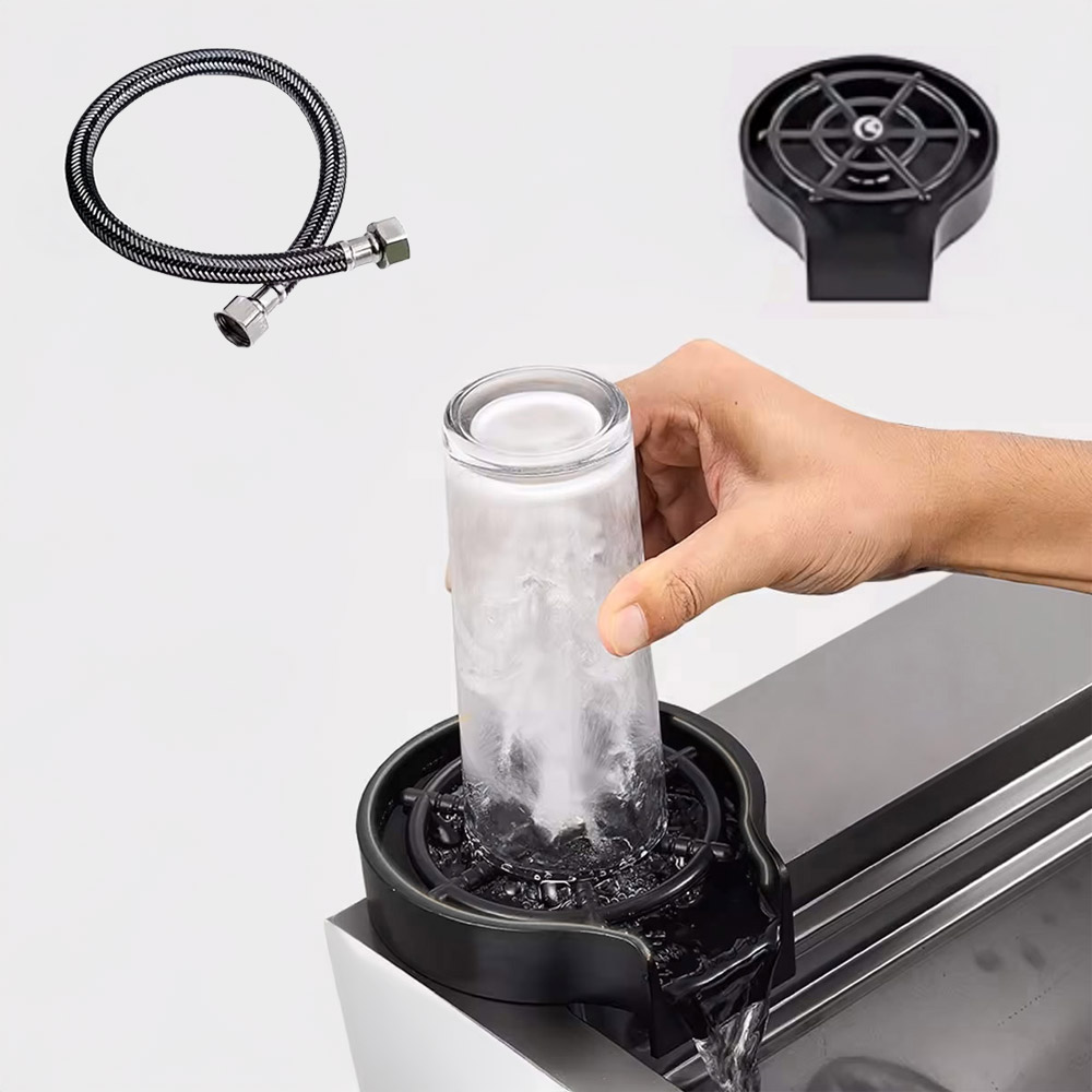Para mayor comodidad, cuenta con una zona central adicional, ideal para preparar alimentos o colocar utensilios mientras cocinás. También incluye una tabla de cortar que se adapta perfectamente a la pileta, un lava vasos para una limpieza impecable y un grifo para agua purificada, brindando experiencia culinaria más saludable.
