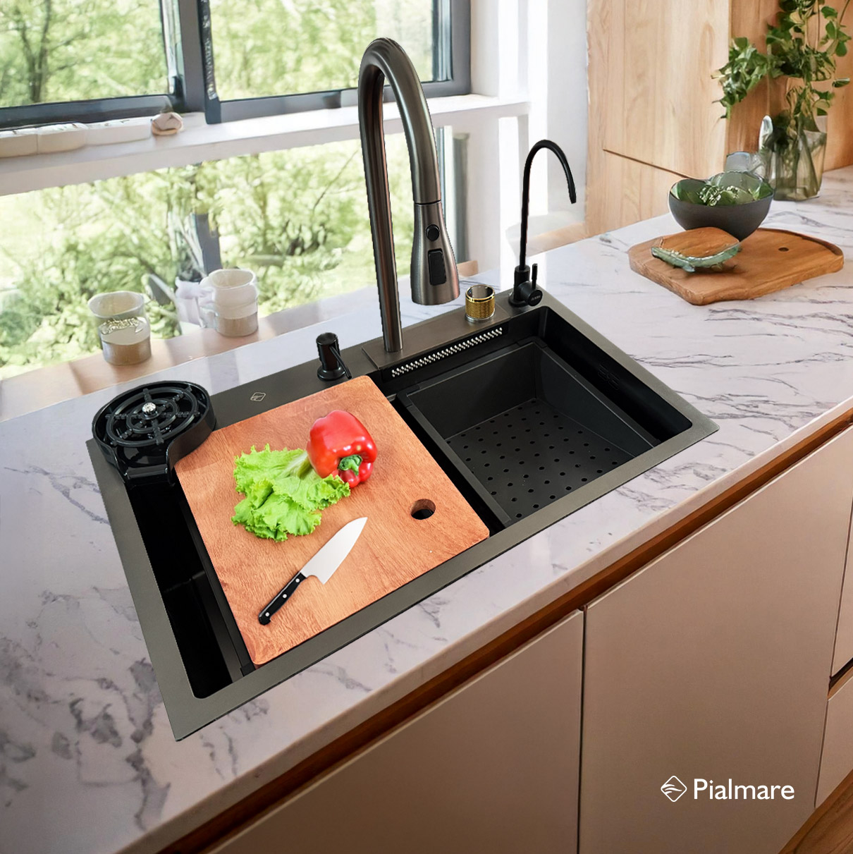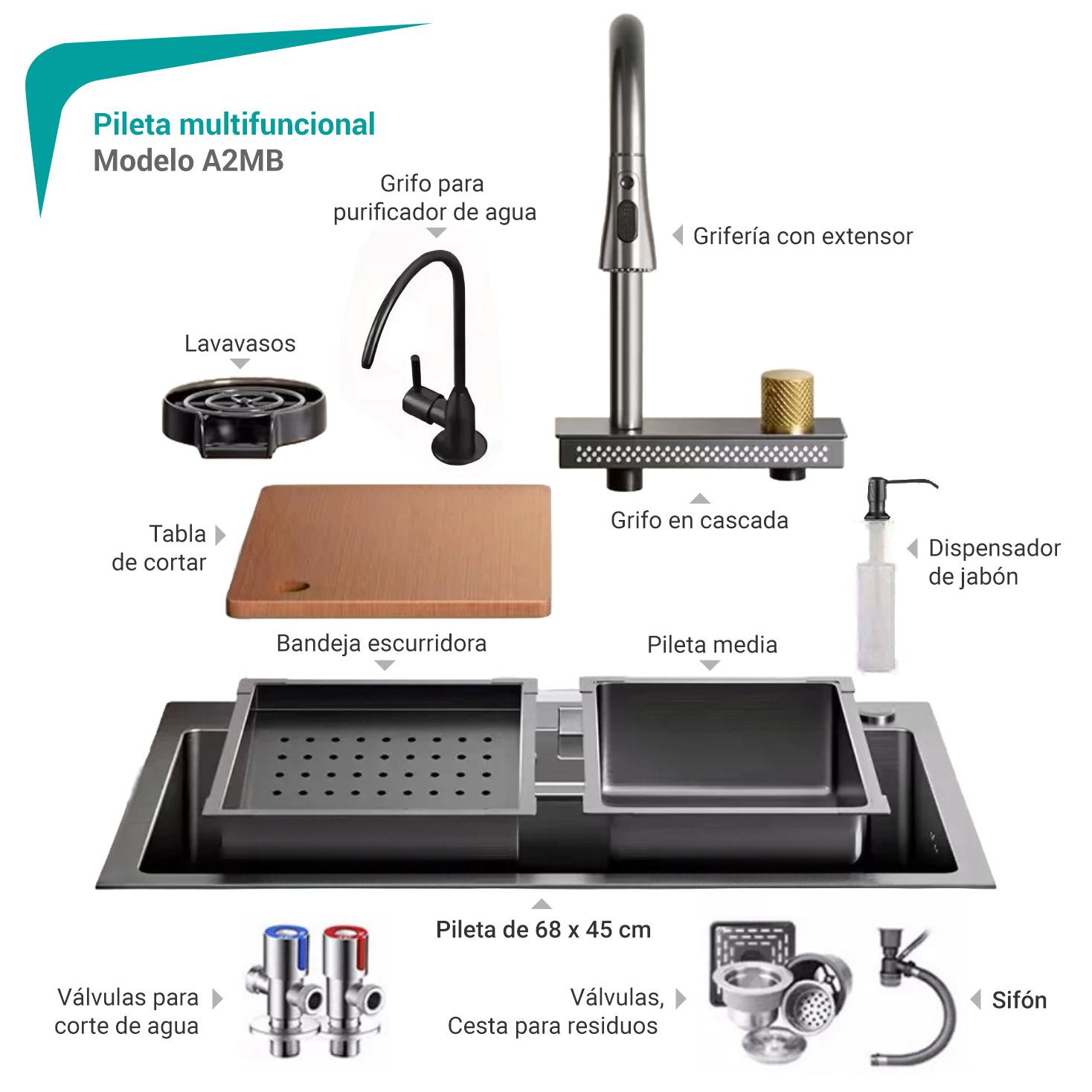 Pileta de cocina multifuncional acero inoxidable 304, color grafito, 68 x 45 cm – Modelo A2MB